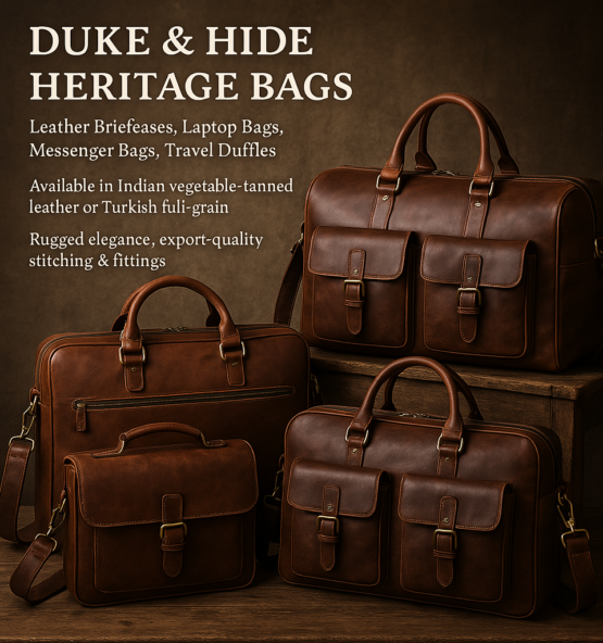 Duke & Hide Heritage Bags – leather briefcases, laptop bags, messenger bags & travel duffels made from Indian vegetable-tanned leather or Turkish full-grain leather. Crafted with rugged elegance, export-quality stitching & fittings. Perfect for business and travel.