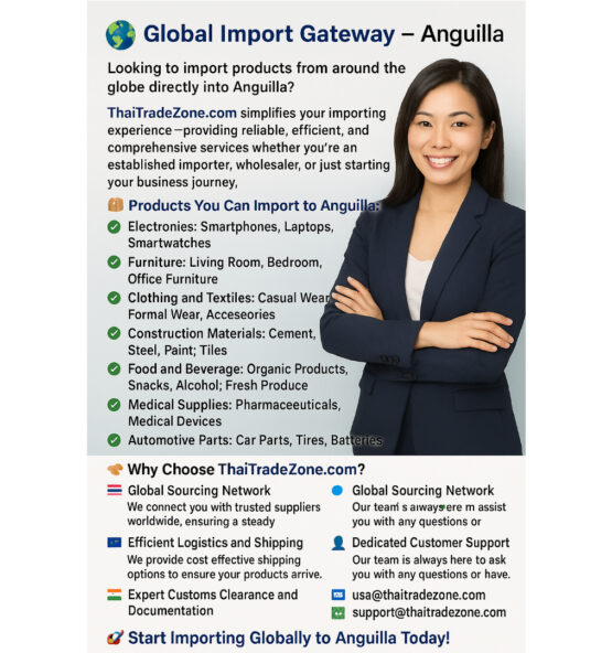 Looking to import quality products into Anguilla? ThaiTradeZone.com connects you with global suppliers, handles shipping, customs, and documentation—making your import process simple, fast, and reliable.