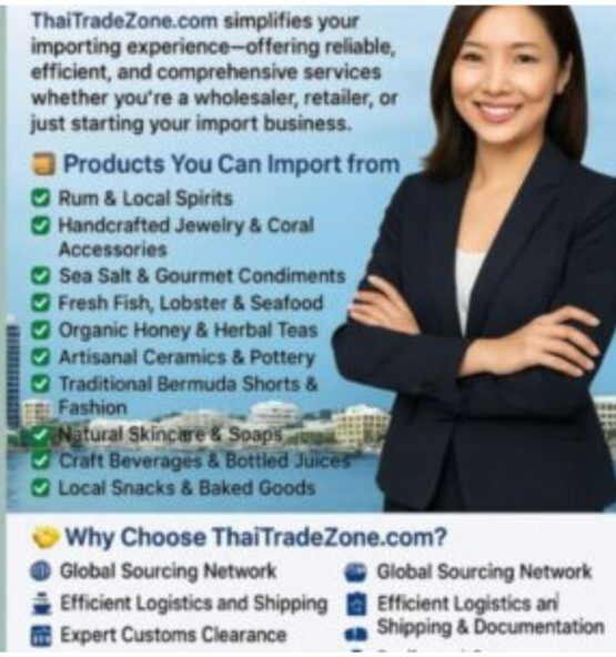 Easily import authentic products from Bermuda with ThaiTradeZone.com. From handcrafted goods to premium seafood, we offer reliable logistics, global sourcing, and expert support for all your importing needs.