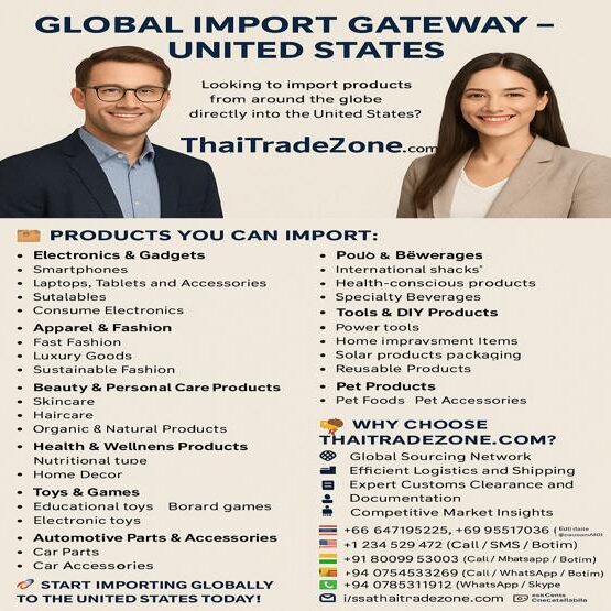ThaiTradeZone.com offers a seamless global import service for businesses looking to import products to the United States. From electronics and fashion to food and health products, we provide comprehensive solutions to simplify your importing process. Enjoy efficient shipping, expert customs clearance, and competitive market insights. Start your import journey today!