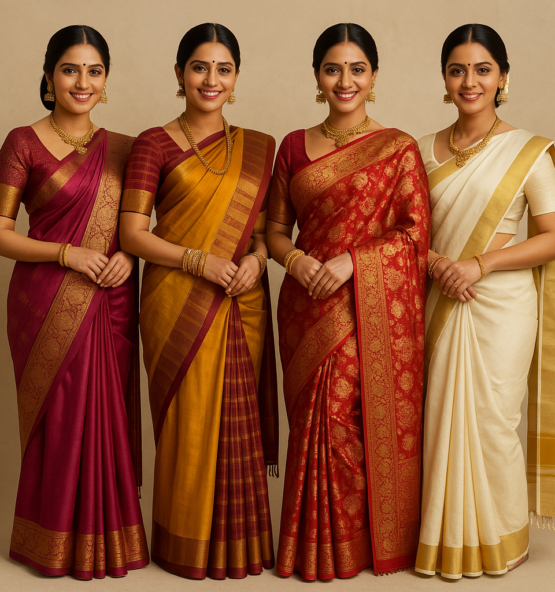 A symbol of Kerala’s cultural identity, Kasavu sarees feature elegant white or off-white fabric with golden borders. These sarees are a timeless choice for festivals, traditional ceremonies, and special gatherings.