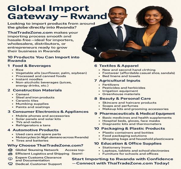 Global Import Gateway – Rwanda Looking to import products from around the globe directly into Rwanda?ThaiTradeZone.com makes your importing process smooth and hassle-free—ideal for importers, wholesalers, distributors, or entrepreneurs ready to grow their business in Rwanda. 📦 Products
