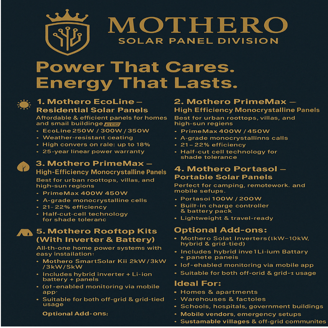 ☀️ Mothero – Solar Panel Division “Power That Cares. Energy That Lasts.” Harness the limitless energy of the sun with Mothero’s premium solar solutions – built for homes, businesses, and adventurers. Whether you’re upgrading your home’s energy system